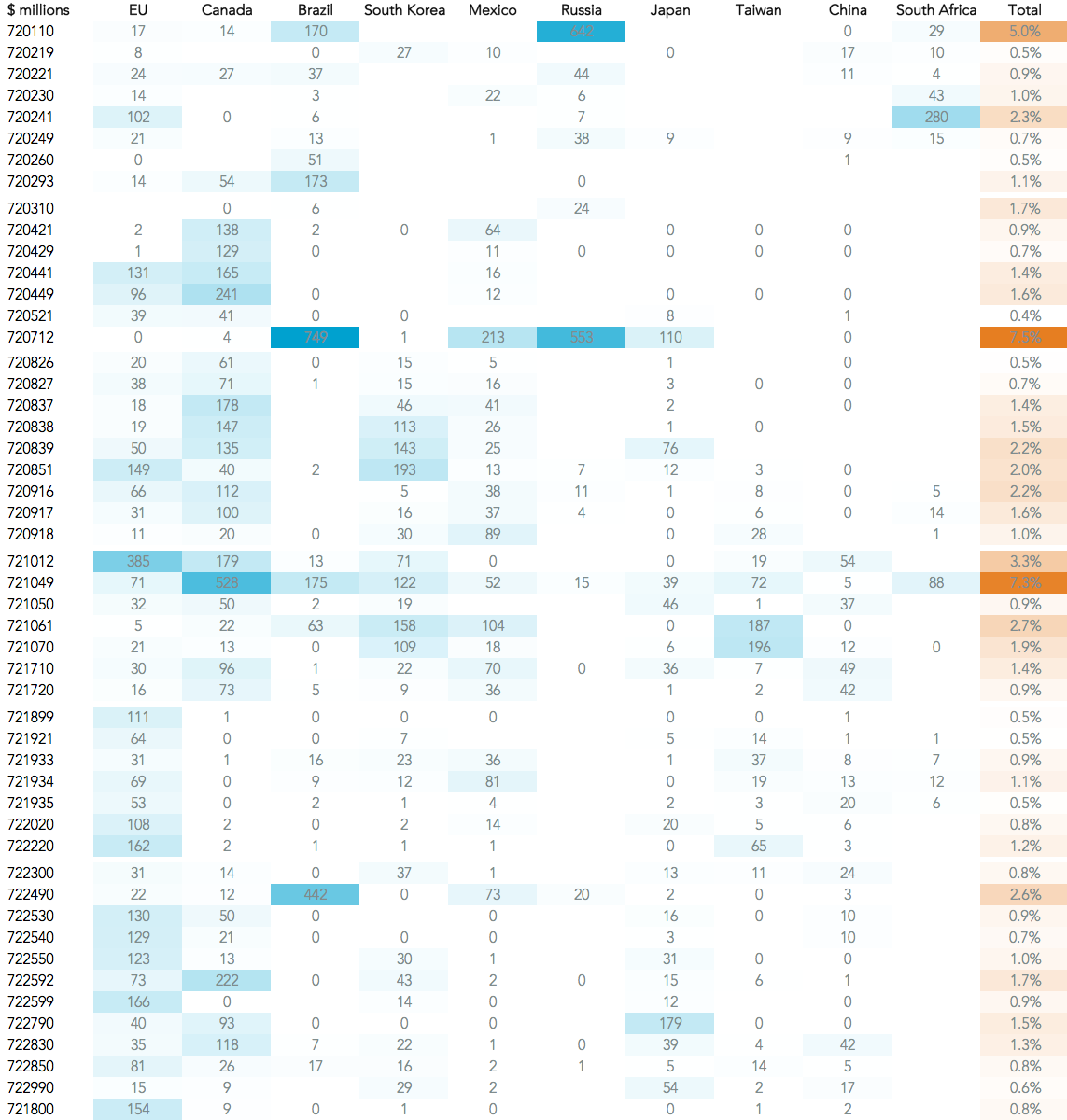 Panjiva analysis of the top 200 U.S. steel (defined by HS-6 code) and its top 10 partners shows the products making the biggest contribution are from the EU, NAFTA, Brazil, South Korea and Russia. High impact product combinations which may attract specific action include: non-alloy semi-finished steel (7207.12) from Brazil and Russia; tin-coated plate (7210.12) from the EU; primary alloy steel (HS 7224.90) from Brazil; ferrochromium (7202.41) from South Africa; and zinc-aluminum coated plate from Taiwan (7210.61).