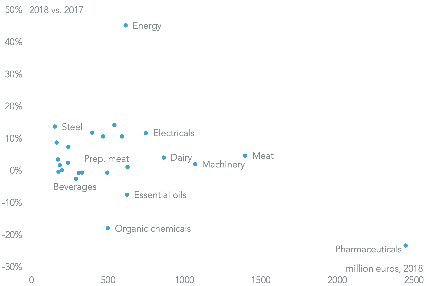 Chart segments Irish exports to the U.K. by product (HS-2) in 2018 and 2017, denominated in euros. Calculations based on Eurostat data.  Source: Panjiva