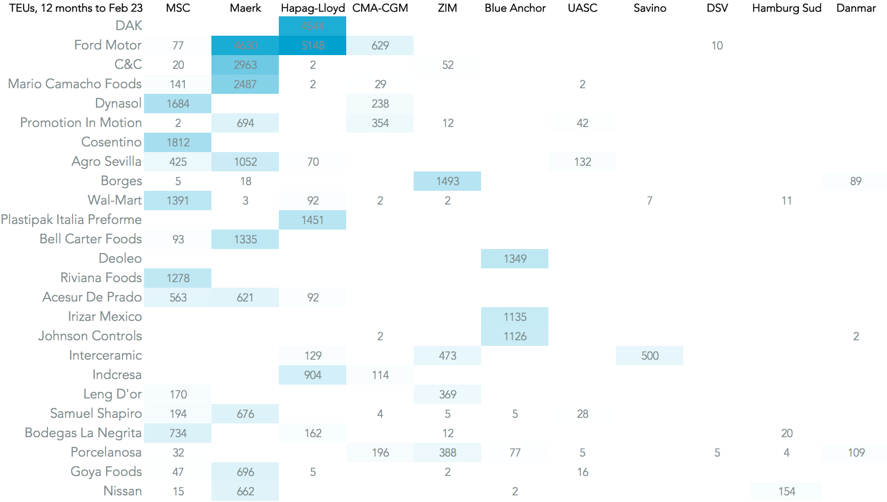 The most exposed consignees on Spain-to-U.S. routes in past 12 months to February 28 – ie ahead of the last round of strikes – are Ford Motor and plastics manufacturer DAK. Maersk was the largest shipper on the lanes, largely driven by its relationship with Ford, while Hapag Lloyd was a close second from working with DAK.
