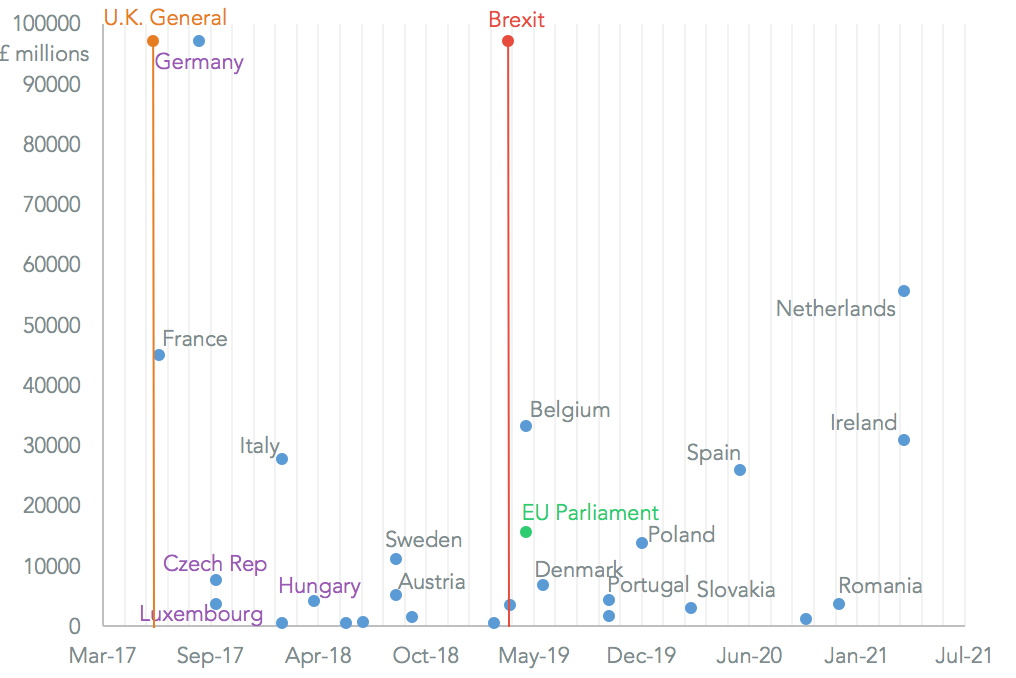 The decision firmly brings national politics into the analysis of how a deal will be constructed and subsequently approved. In that regard the U.K. faces elections – not just its own on June 8 – across 13 member states accounting for 52.8% of its trade in goods with the EU in the 22 months remaining until March 2019 when the exit takes effect. Some of these, such as Germany, are unlikely to involve changes in ruling parties. Others, as has just been seen in France after Presidential elections and before parliamentary elections on June 18, can bring significant change.