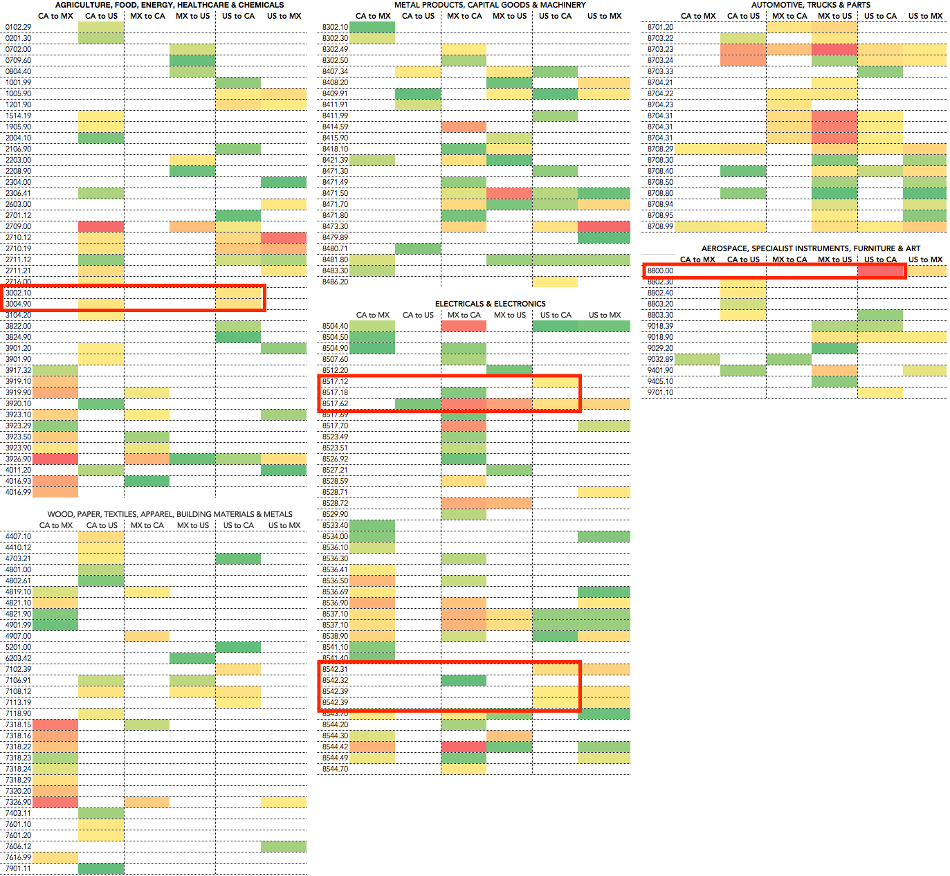 Chart is based on top 50 exports by HS code, for the 12 months to November 30, for the U.S., Canada and Mexico based on U.S. and Mexico data. Red represents highest proportion of total exports, green the lowest while blank cells indicate no position in the top 50. Red boxes highlight major export sensitivities. Click the chart to see a high resolution version. Source: Panjiva