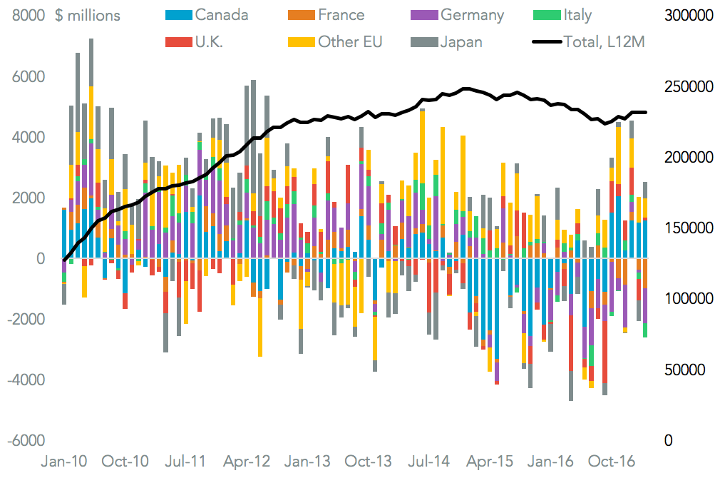 If the meetings with Israel and Saudi Arabia show the need to balance security and trade policies, the G7 summit will likely focus mostly on trade. The U.S. runs a trade deficit with all but one of the G7 members (the U.K.), which totalled $231.7 billion in the 12 months to March 31. That was 5.8% below its November 2014, largely as a result of a falling deficit vs. Germany being offset by a rising deficit with smaller EU states and Canada’s energy-driven surplus.