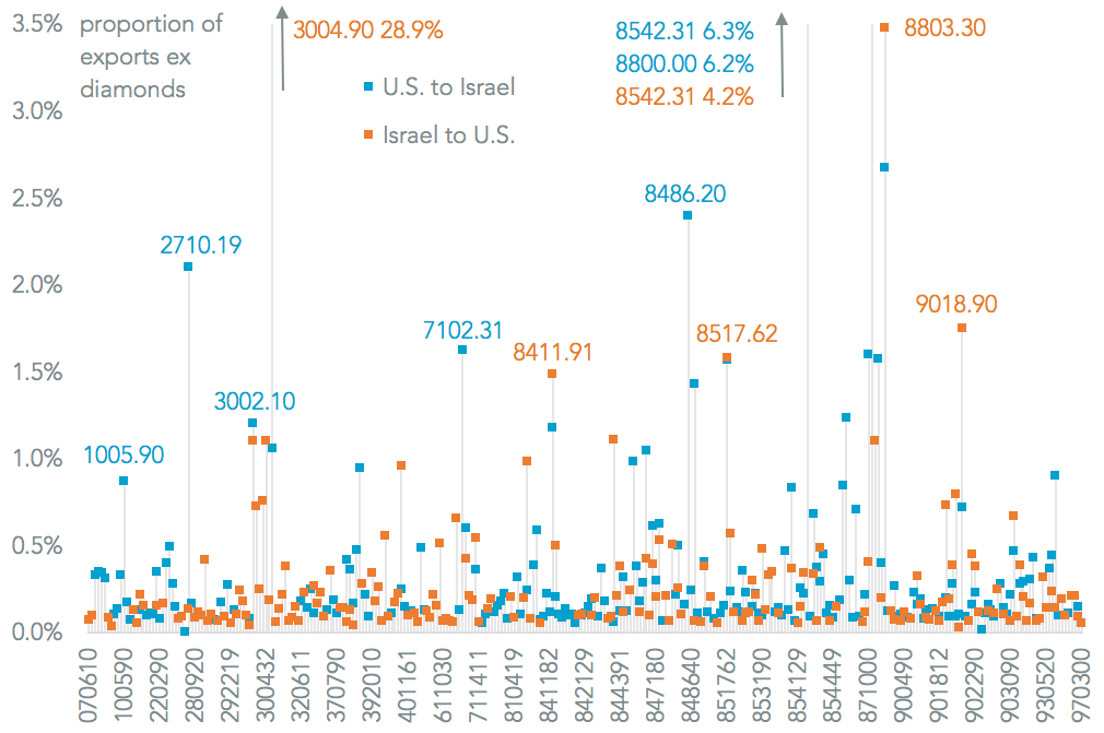 Putting aside diamonds (which account for 33.5% of bilateral trade and $2.2 billion of the U.S. deficit) top export lines from Israel are dominated by pharmaceuticals (28.9% of exports ex diamonds) and medical devices (1.8%), Panjiva analysis shows. That may mean the President’s aims to cut healthcare costs are discussed. There is significant bilateral trade in semiconductors (6.3% of Israeli exports, 8.7% from the U.S. including equipment) and aerospace (4.9% from Israel, 8.8% from the U.S. including parts), suggesting closely linked supply chains that may be difficult to unpick.