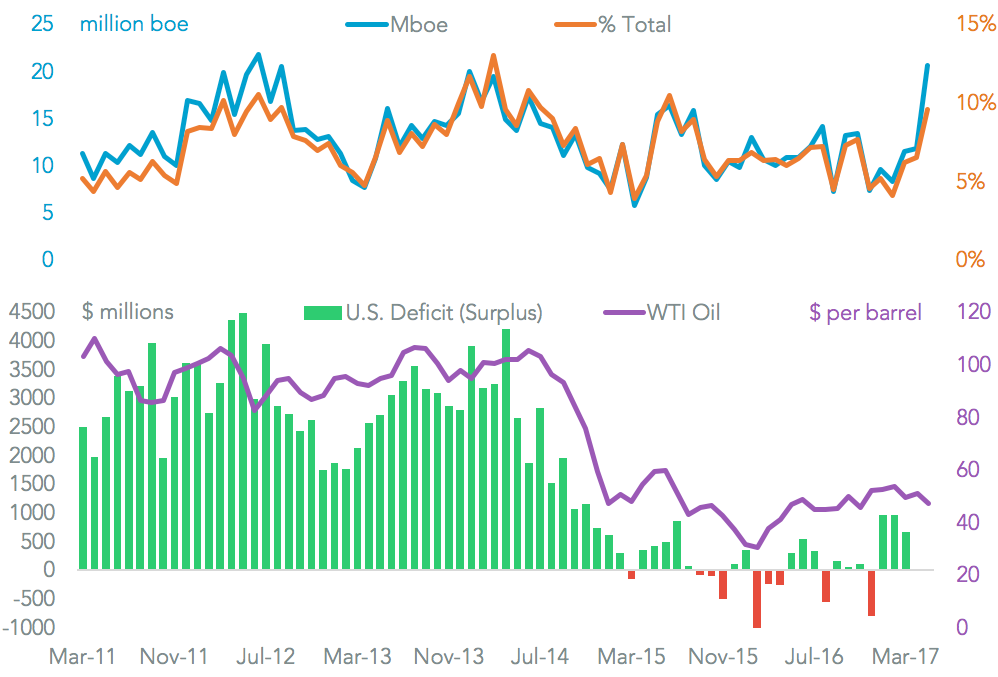 However, the Trump administration’s “ America First Energy Plan” First policy calls for “energy independence from the OPEC cartel”. In the 12 months to March 31 6.4% of U.S. oil imports were sourced from Saudi Arabia, Panjiva data shows. In March that figure rose to 9.6% as imports from Saudi Arabia reached their highest since June 2012. One offset may come from increased investment from Saudi Arabian authorities in U.S. infrastructure, which could reach $40 billion according to CNBC.