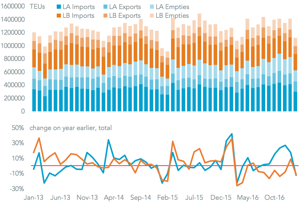 The Ports of Los Angeles and Long Beach experienced an 11.9% contraction in container handling in February compared to a year earlier. Long Beach outperformed Los Angeles for the first time since June 2016, suggesting the problems that had beset it in the wake of the Hanjin Shipping bankruptcy may be behind it. While Long Beach’s volumes fell 11.2%, those for Los Angeles dropped 12.4%. Within Los Angeles’ drop was a 19.8% drop in import volumes, making it the worst performing large port in the nation, as discussed in Panjiva research of March 8. One area where it did better than Long Beach was in exports, which increased 6.1% vs. a 2.6% fall for Long Beach.