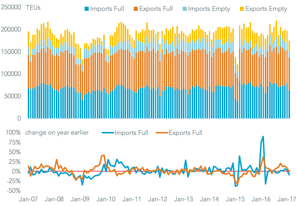 The problem was not isolated in southern California. The Port of Oakland’s container handling fell 7.0% on a year earlier in February. That also included with imports falling significantly – by 9.2% – offset by a better export performance, though they were still 1.2% down. In aggregate the three ports’ imports fell 17.1%, while exports inched ahead 1.4% bringing total traffic to an 11.3% drop on a year earlier.