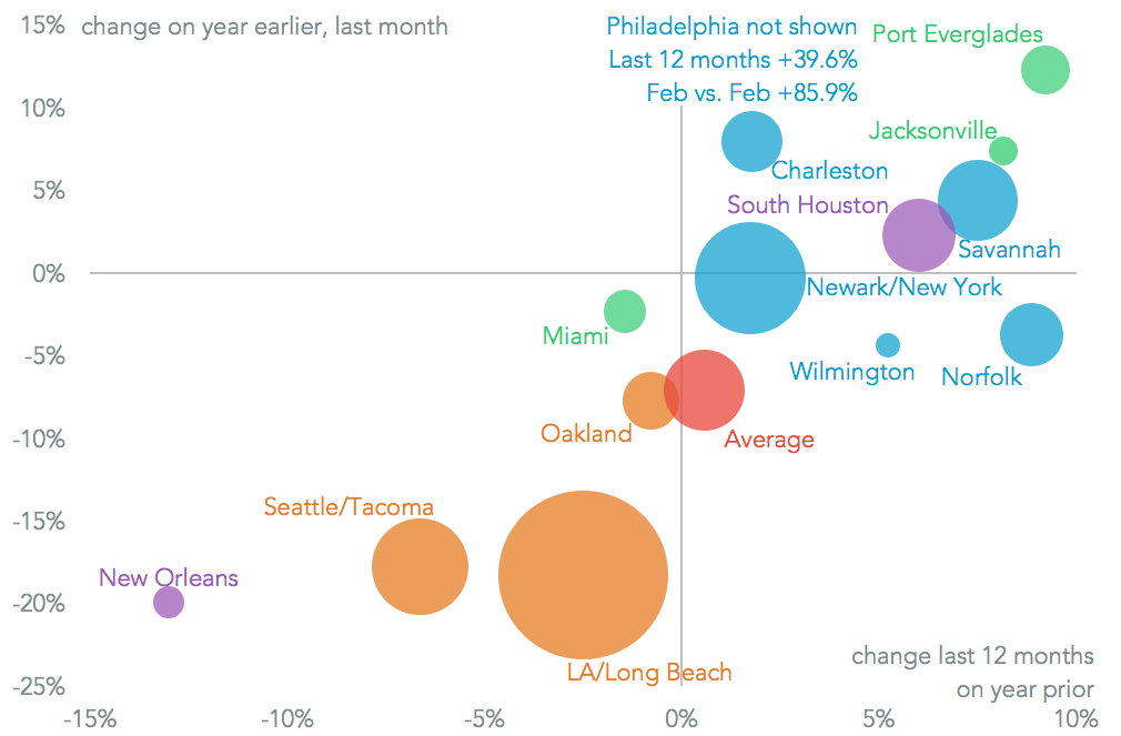 Seattle managed to maintain its 10th place ahead of Port Everglades, but after four straight months of declines it fell to its lowest level of handling since at least 2007. Philadelphia’s tear continued, with its 85.9% jump in handling on a year earlier not quite sufficient to assure 11th ahead of Miami.