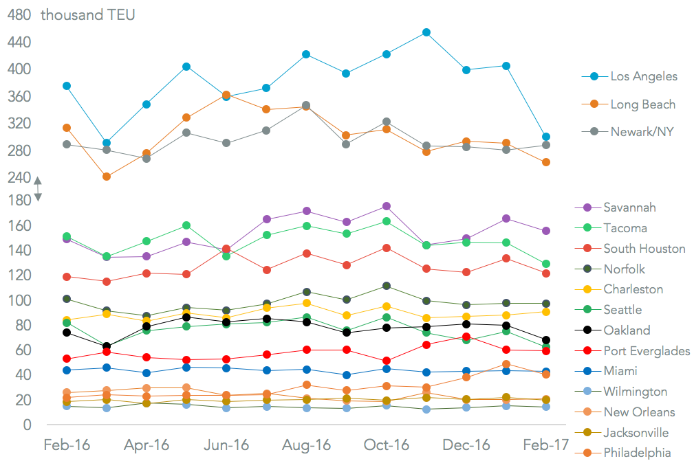 U.S. seaborne, incoming container handling dropped 7.1% on a year earlier in February, preliminary Panjiva data shows. That likely reflects a mixture of the timing effects from the lunar new year on Asian shipments, as well as a reduced urge among importers to beat new taxes or tariffs, as discussed in Panjiva research of March 7.