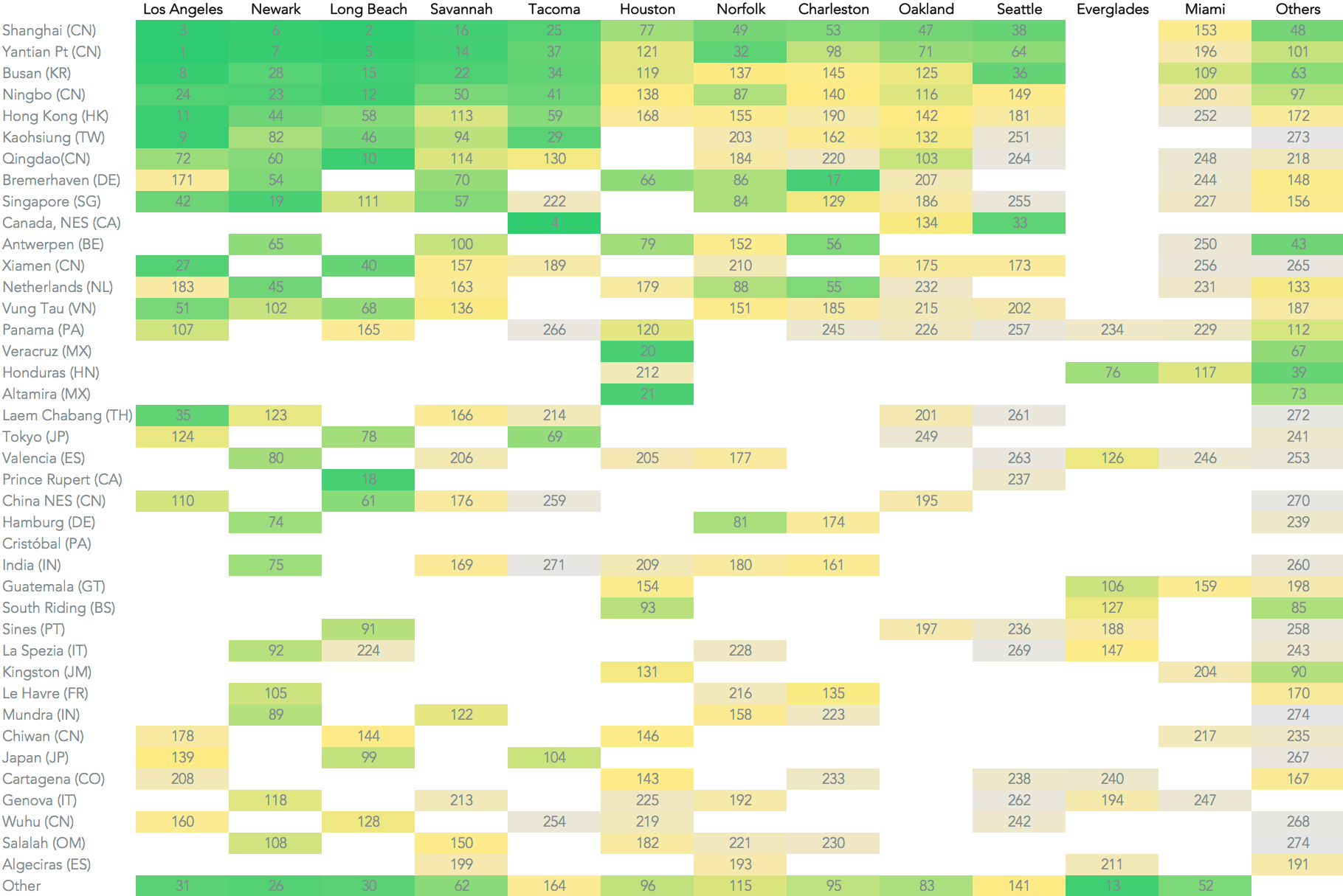 Panjiva’s analysis of over 500 port-to-port pairs shows Yantian-to-Los Angeles was the top combination, followed by Shanghai-to-Long Beach. Tacoma’s exposure to mid- and small-scale Canadian ports (the fourth ranked combination) explains the region’s poor performance – outside energy Canada’s exports have been falling. Newark/New York’s relative high exposure to Asia explains its modest slowdown, while Houston’s exposure to booming Mexico helped its steady expansion.