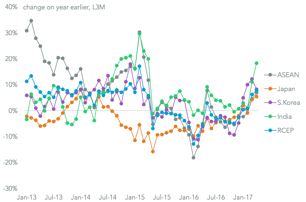 China’s position will be vital, though near-term it may be pre-occupied with U.S. relations. One of the time pressures on China is the National Congress in October which will set the tone for leadership in the coming five years. Economic pressure may be lacking – Panjiva analysis of Chinese exports shows growth to RCEP countries is actually accelerating. In the three months to April 30 shipments expanded by 7.7% vs. a 2.7% decline in the fourth quarter of 2016.