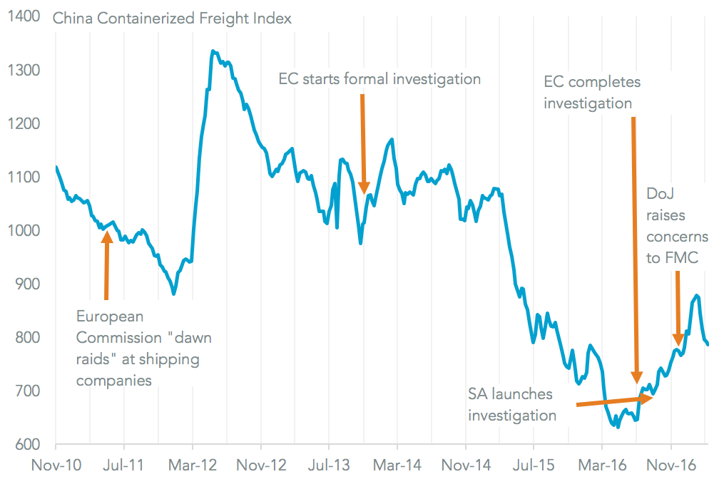 The U.S. Department of Justice has served subpoenas for information at a meeting of 20 container-lines including their CEOs, the Wall Street Journal reports. It is not clear whether the case relates to specific allegations, shipping alliances in concept or price setting in the shipping industry generally. It follows a European Commission investigation concluded in July that looked at the pricing communications by the shippers, as outlined in Panjiva research of July 7, as well as specific accusations of collusion by the South African authorities.