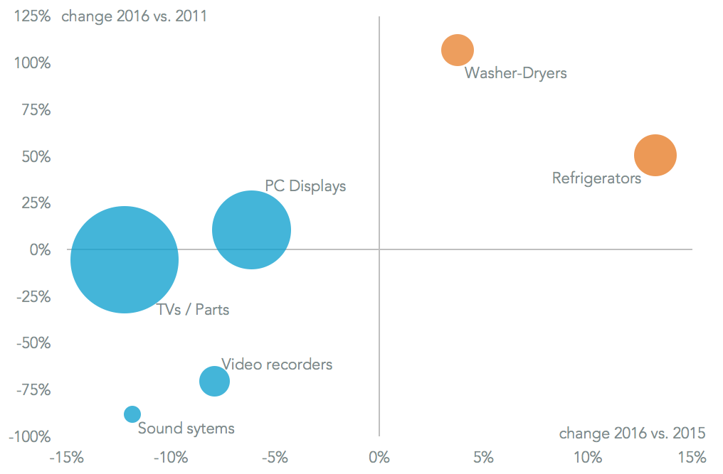 Samsung Electronics is considering building a U.S. factory in response to the Trump administration’s protectionist stance, Reuters reports. This would likely come at the expense of Mexican manufacturing of home appliances. Panjiva data shows total Mexican exports of consumer electronics – including TVs and PC displays – to the U.S. already fell 10% in 2016 vs. 2015 to $39 billion, while shipments of appliances such as fridges and washers climbed 10% to $6 billion. Samsung Electronics is likely the largest exporter in a group that includes Sony and Whirlpool among others.