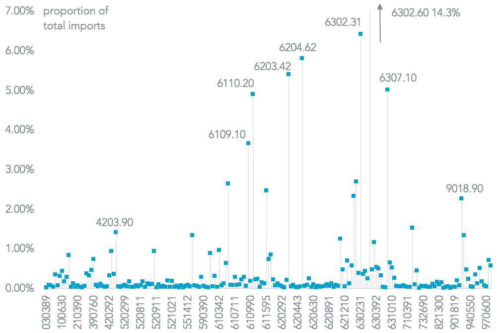 Panjiva analysis of Pakistan’s top 200 exports to the U.S. show apparel and textiles each account for 37% of the total, making them prime targets for tariffs or quotas. Other product areas of prominence include leather goods (3%) and medical instruments (2%) which might be targeted in more focussed measures.