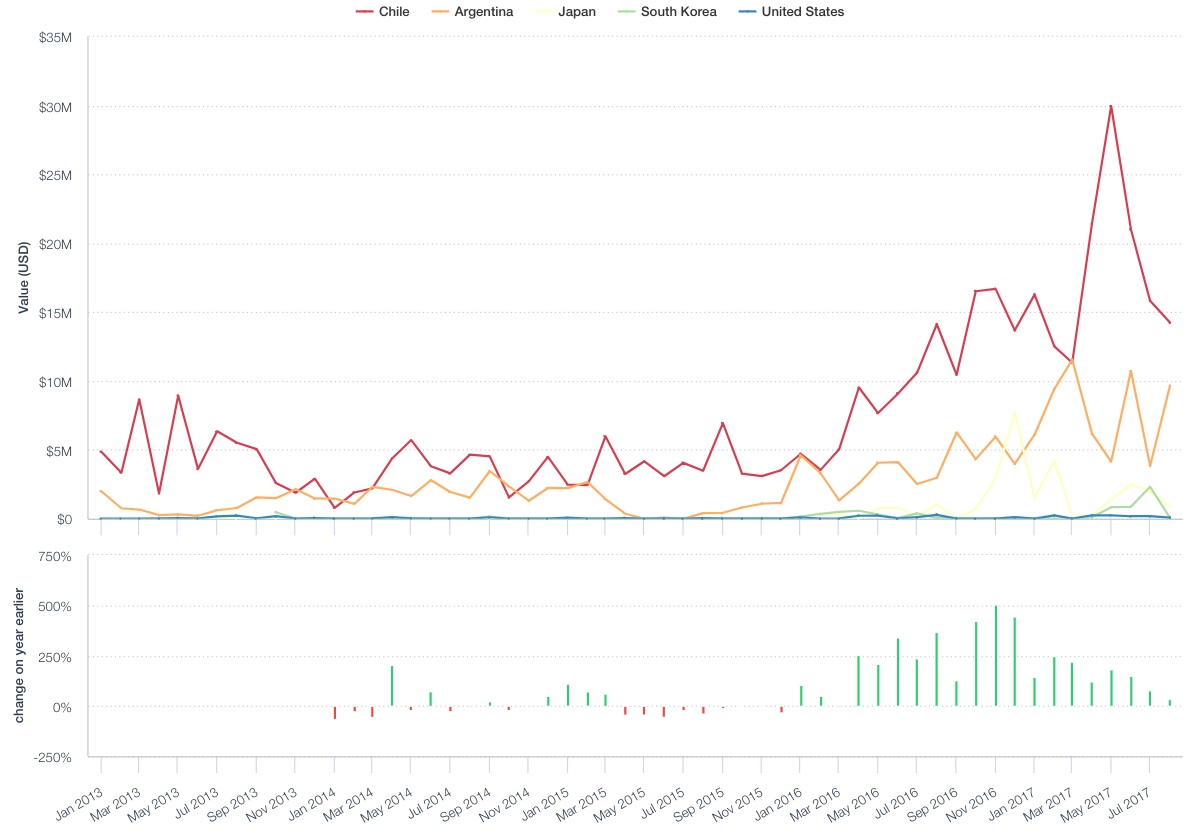 Panjiva data shows imports by Tesla Beijing in the quarter to August 31 (approximating 3Q sales) rose 22% sequentially to $432 million, whereas group revenues are expected to rise by just 5%. The challenge will be extending Tesla’s supply chain. If it builds a “gigafactory” for batteries it will be competing with Chinese domestic manufacturers for local lithium supplies, as well as imported resources that rose 2.6x in the past 12 months on a year earlier.