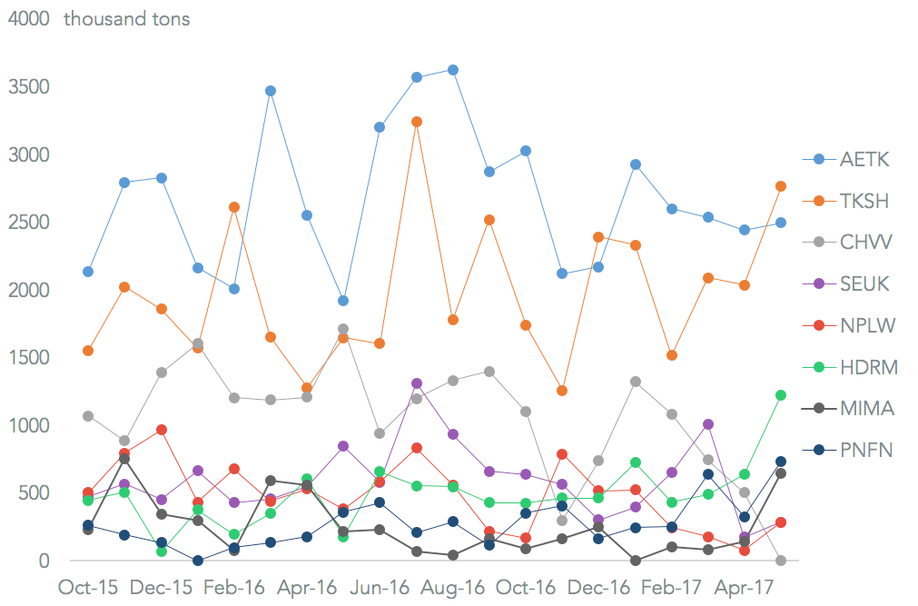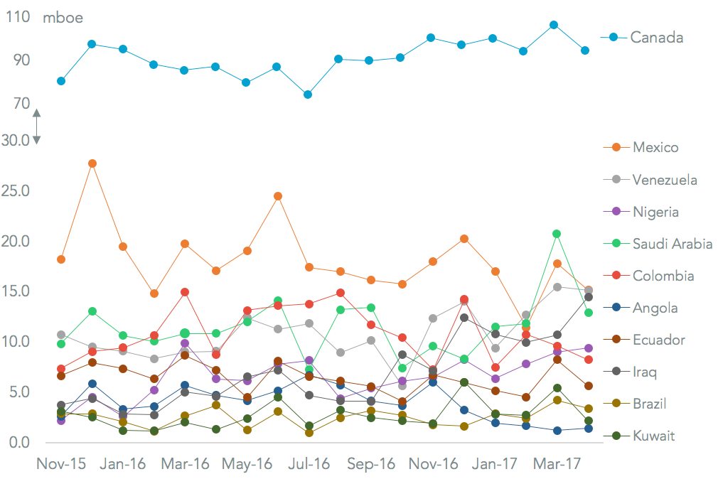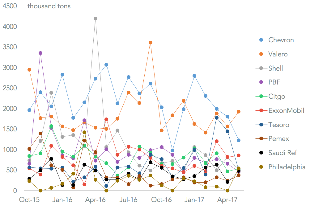 Among the smaller operators, LyondellBassell’s Houston Refinery imported oil for a second month, having previously only done so in May 2016, making it the fourth largest importer for the month.