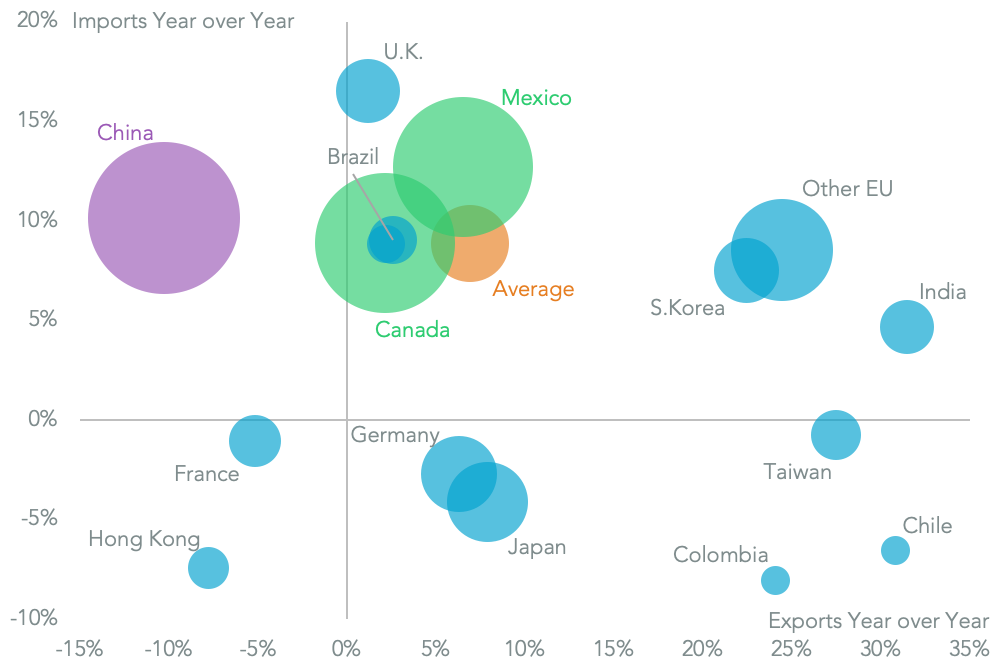 The U.S. trade deficit surged 21.6% higher in September vs. a year earlier to reach $54.02 billion, Panjiva analysis of official data shows. That was the 19th month of expansion since January 2017 and wa largely down to a 17.2% jump in the goods deficit which, at $77.23 billion, was the highest since July 2008.