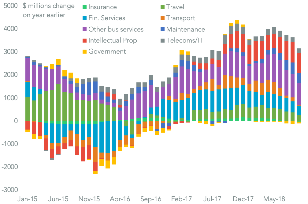 An 8.0% expansion in the services surplus marked a slowdown from 9.4% a month earlier and was largely due to weaker services exports growth. The insurance sector was the main problem area after a 1.4% decline, while financial services grew at the slowest rate since September 2016. Additionally the transport sector (airlines) grew by just 0.1%, the slowest expansion since the sector started to recover in 2016.