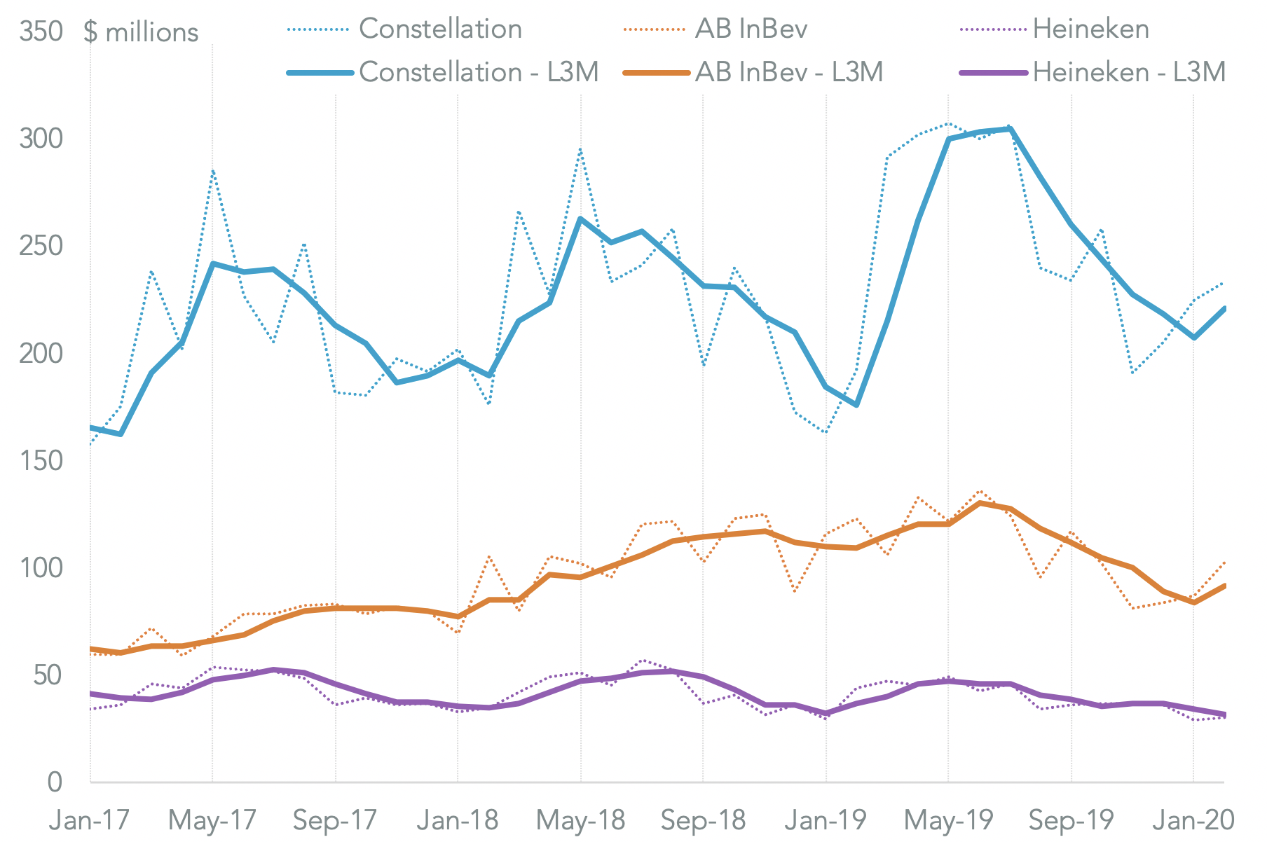 By contrast there’s been a 21.4% surge in shipments linked to Constellation brands after a 4.0% improvement in Q4. The extensive “shelter in place” measures now being taken in the U.S. may lead to a reversal in the U.S.-bound shipments for all three firms in the coming months.