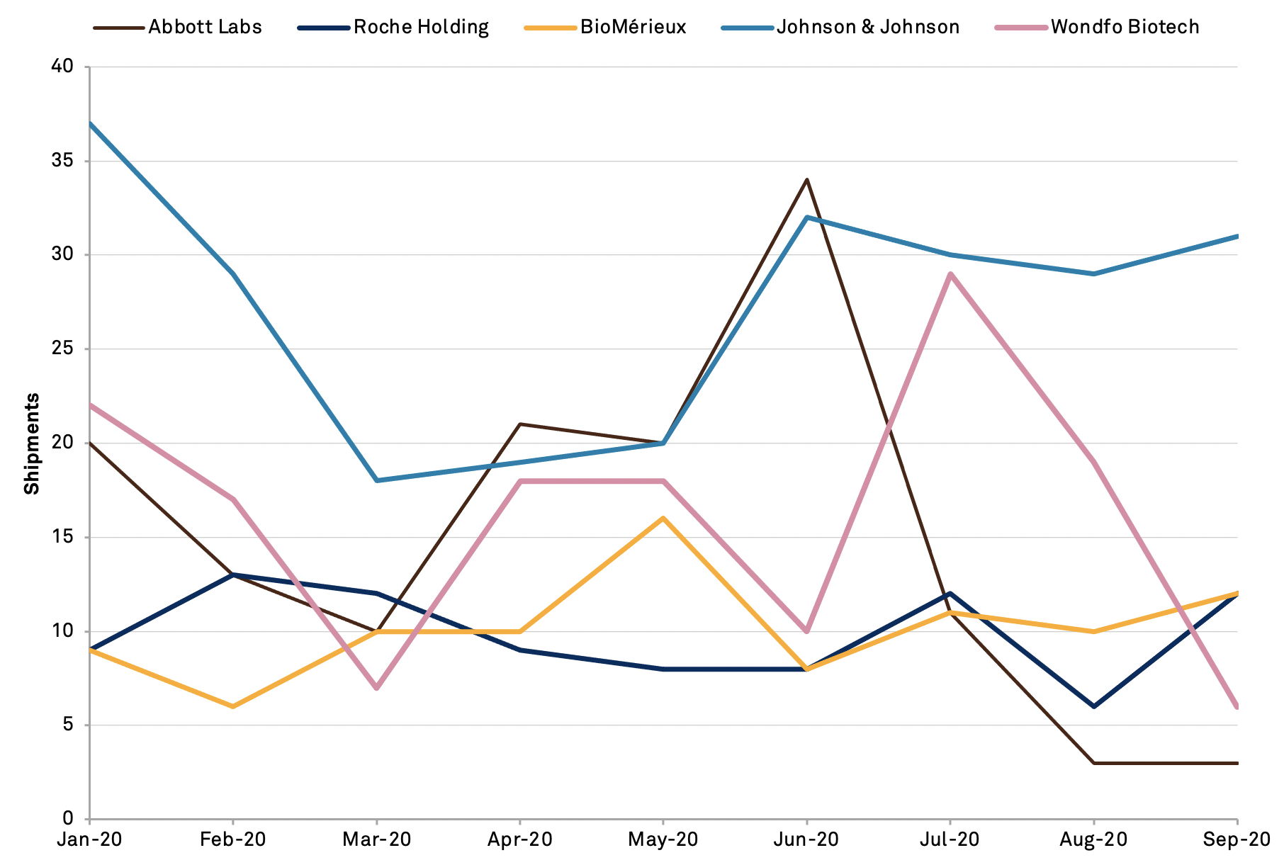There are signs that imports may have picked up a little further in September, with seaborne imports of test kits having increased by 10.7% sequentially compared to August. That’s included a pickup in shipments linked to Roche Holding and Johnson & Johnson – a backer of Cue Health – while shipments linked to Abbott Labs and Wondfo Biotech have been in decline.