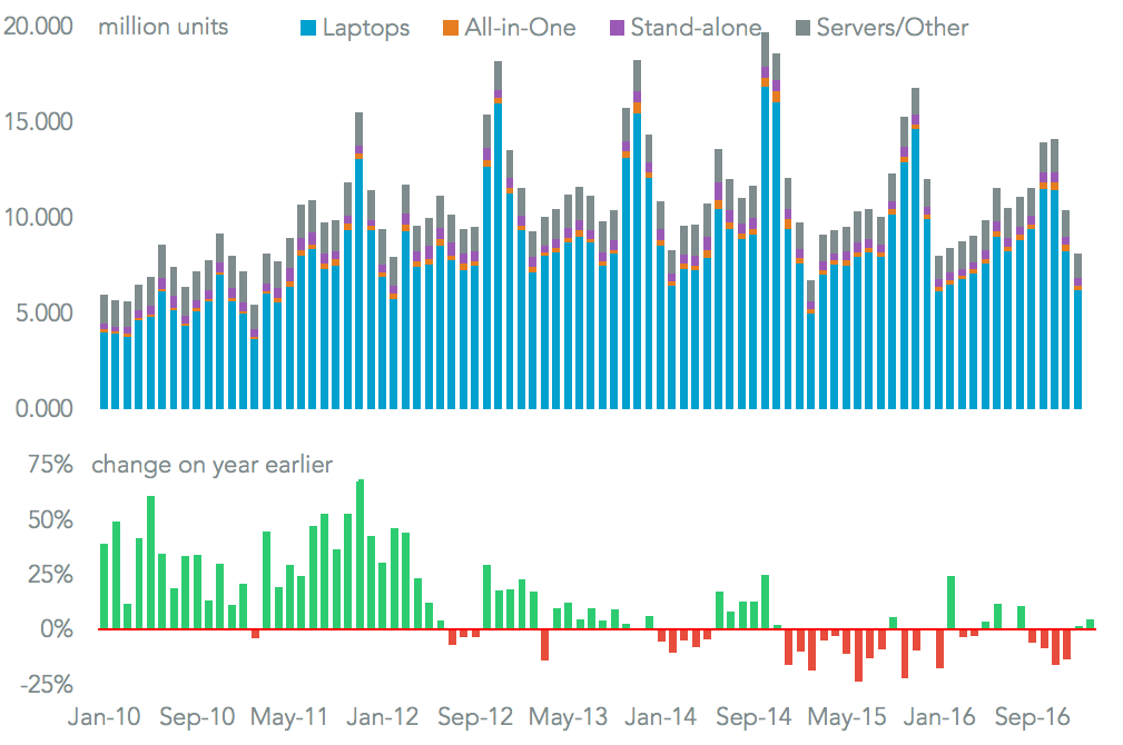 The U.S. personal and business computing market may be staging a recovery in the first quarter. That follows a “slight decline” in sales in the fourth quarter, according to IDC. Total imports across laptops, desktops, all-in-ones and servers increased 1.4% on a year earlier in January to reach 16.26 million units, Panjiva data shows.