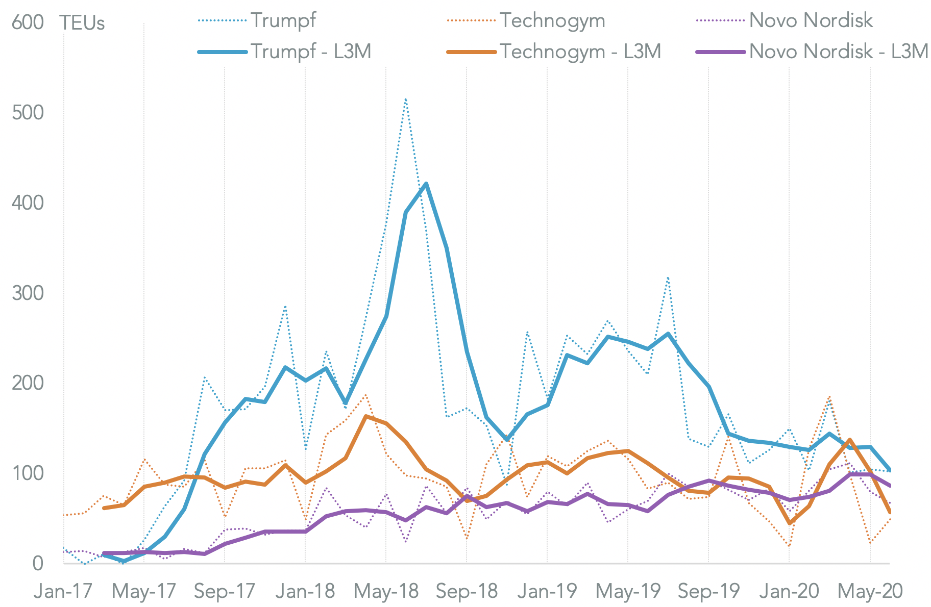 Other European based users of DP-DHL’s services on U.S.-seaborne lanes that have experienced a marked downturn in shipping in Q2 include machine tool maker Trumpf with a decline of 56.7% year over year and leisure products maker Technogym with a 48.4% slide. That’s been partly offset by notable successes including a 46.3% rise in shipments linked to Novo Nordisk – helped by demand for healthcare products in the wake of COVID-19 – and a 20.6% rise in shipments for LVMH’s Christian Dior.