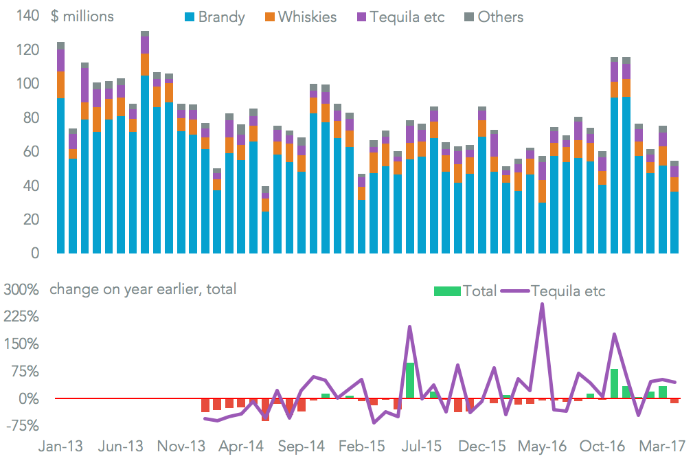 Chart shows Chinese imports of spirits segmented into brandy, whiskies, tequilas and others – lower panel shows change on year earlier. Source: Panjiva