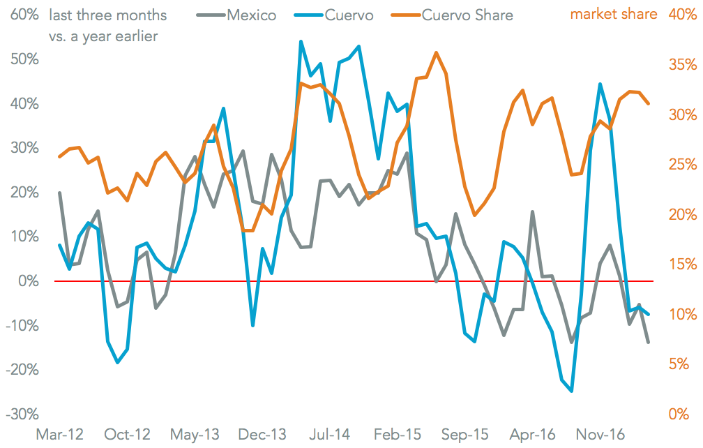 Data for Mexican exports of HS 2208.90, segmented based on company name for Jose Cuervo. Figures shown on trailing three month total basis. Source: Panjiva