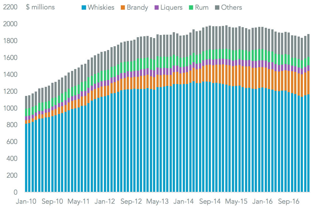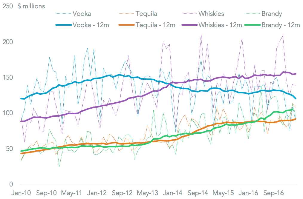 Chart segments U.S. imports of spirits (HS 2208) by spirit type. Dotted lines indicate monthly value, solid lines the 12 month trailing average. Source: Panjiva
