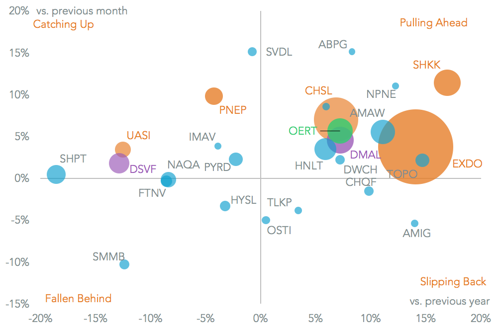 Improvements were concentrated on Expeditors (number one operator, and 14.1% better than a year earlier) and DB Schenker (17.0% higher than a year earlier). Weather disruptions later in the month by Hurricane Harvey – and likely to occur again in September from Hurricane Irma – do not appear to have been a big issue generally. Panalpina did suffer outages in its facilities according to company filings, and saw a 4.2% drop in handling vs. the prior year as a consequence. It has an outsized exposure to Texan ports vs. the country in total. UPS shipping also saw a 12.5% decline.