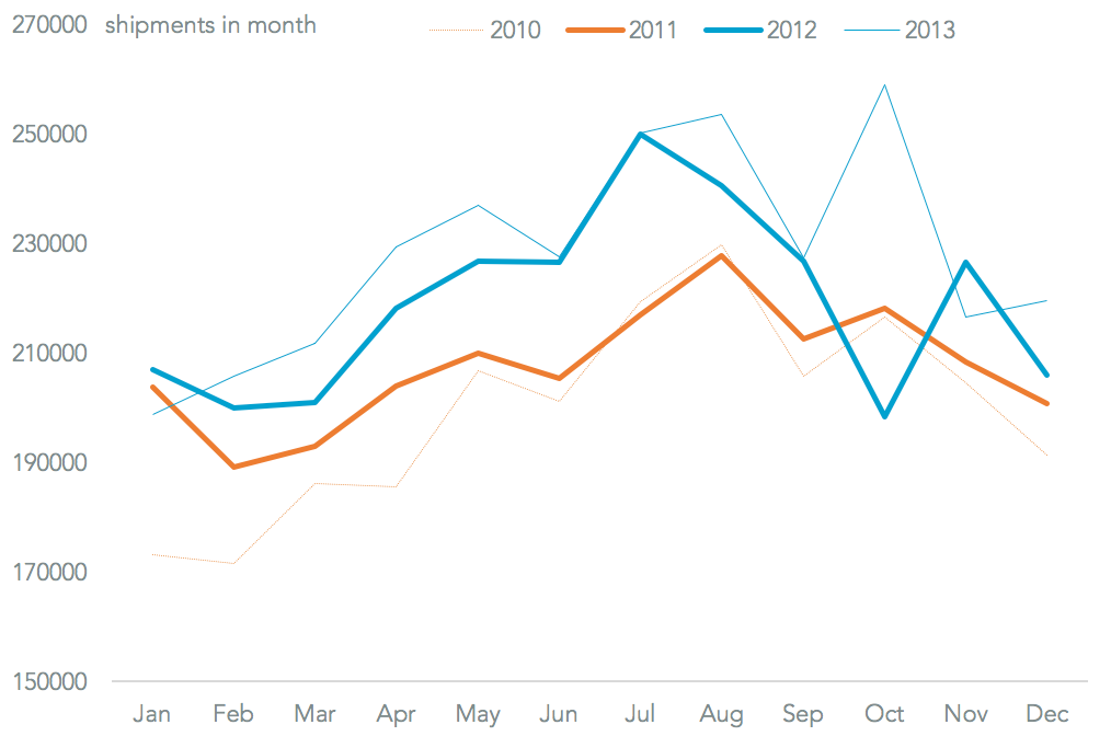 Sandy was more significant – at least so far – in that it had a broader area of disruption across the eastern-seaboard. Panjiva data shows it disrupted 9% of traffic for the entire month across the region, with most deliveries recovered in the following month. Timing matters for Harvey too – while it is in the peak shipping season, closures are focussed across two weekends and (potentially) the Labor Day holiday.