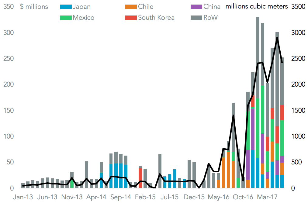 Harvey’s impact may not be limited to oil and containerized freight. Predictions from NOAA indicate there may be a second landfall around the Texas-Louisiana border. That may result in closures for Cheniere’s Sabine Pass liquefied natural gas facility. Panjiva data shows exports in the second quarter increased 5.5x in volume terms on a year earlier, which meant shipments increased 12.9% in the second quarter vs. the first. The impact should, however, be minimal given the disruption will be caused by rain rather than wind, though restrictions to gas supplies to the terminal can’t be ruled out.