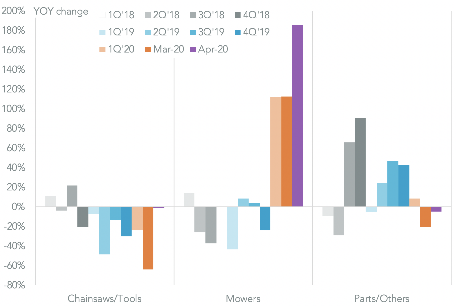The improvement runs the risk of course that the firm is left with excess inventories if lockdown don’t come off before the peak season of purchasing before the summer. At the product line much of the recent surge has come from garden equipment including lawn mowers where imports jumped 112.2% year over year in Q1 and by a further 185.7% in the first two weeks April.