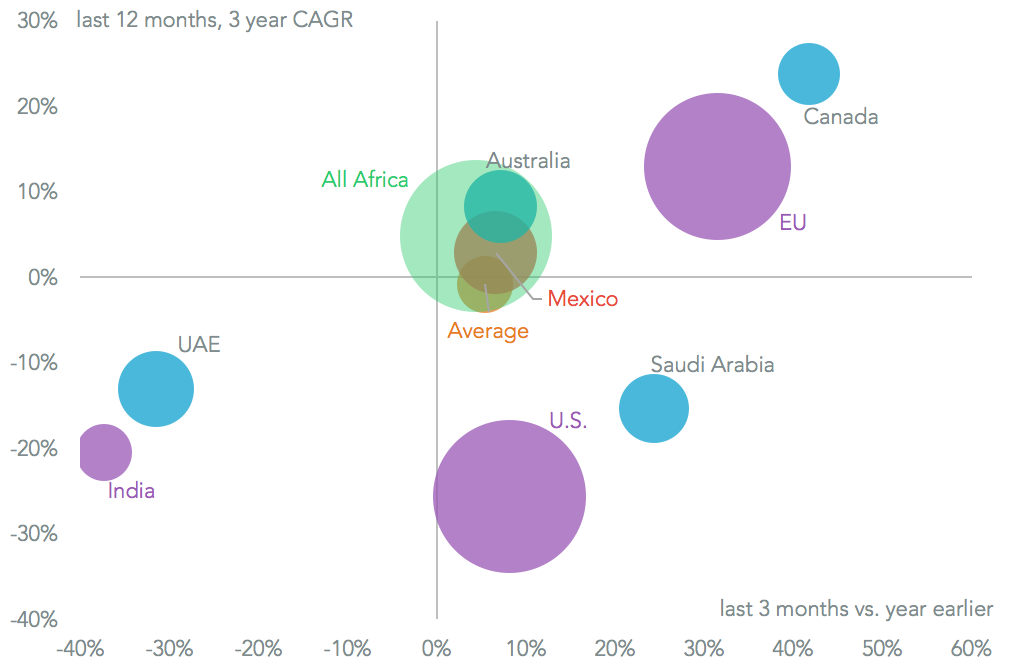 Chinese manufacturers have faced similar cases in the European Union, as outlined in Panjiva research of August 11, and the United States. As a result exports fell 6.9% annually over the past three years, despite a rebound of 5.4% in the past quarter on a year earlier. That has left manufacturers looking for alternative markets, and possibly alternative routes to market as s 41.8% surge in shipments to Canada in the past quarter suggests.