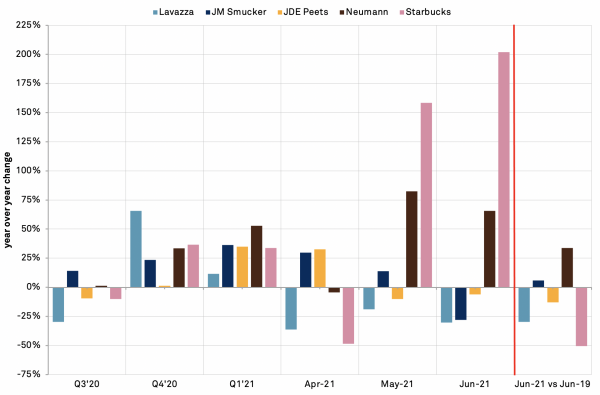 Panjiva’s data shows that Brazilian exports linked to JDE Peet’s fell by 6.1% year over year in June which extended a downturn in May and left shipments 13.0% below June 2019 levels. Shipments associated with JM Smucker fell by a more rapid 27.9% year over year in June, reversing an earlier increase but were nonetheless 5.9% better than exports in June 2019. Starbucks likely experienced the fastest expansion in June on a year-over-year basis with a 201.9% rise, though that likely reflects the recovery of foodservice demand and exports were still just half of what they were in June 2019.