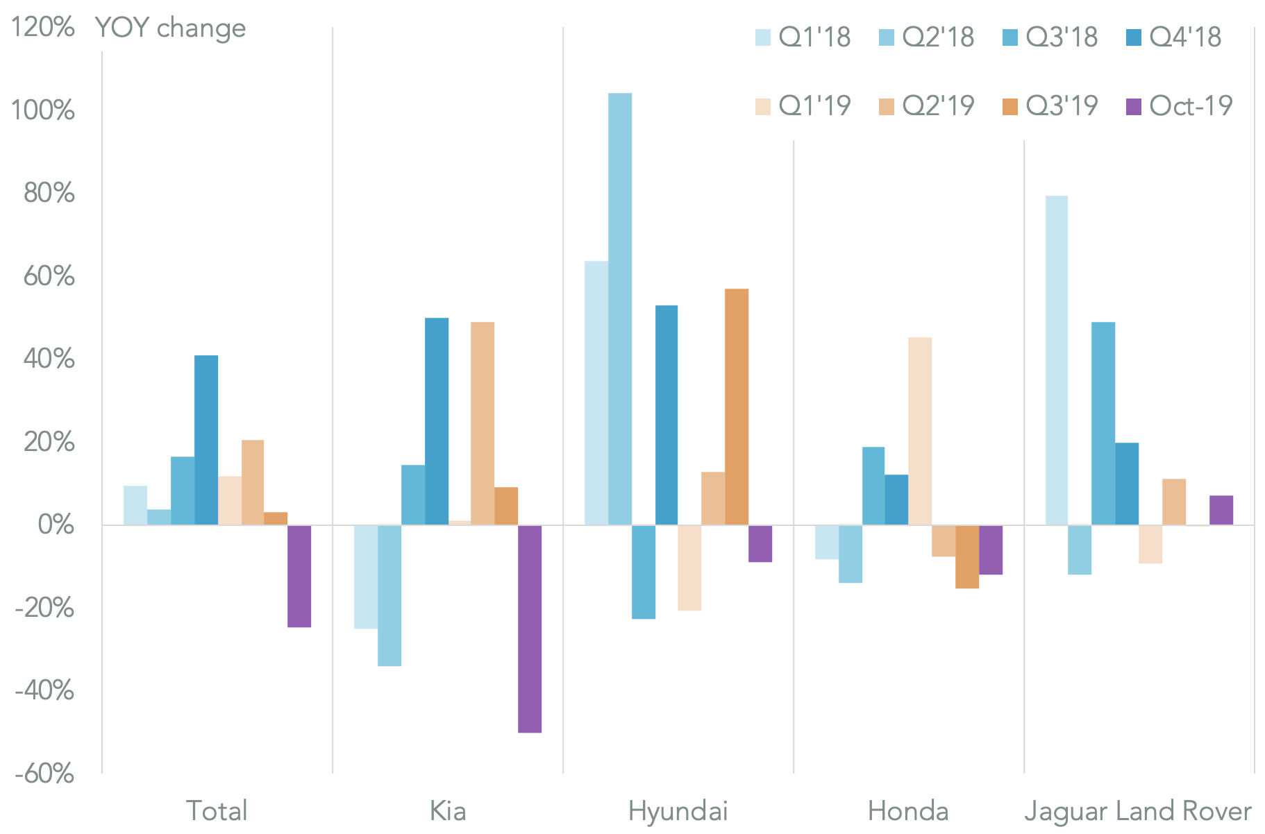 Honda also saw a downturn in shipments of 11.9% in October though it’s imports more generally have been in an extended downturn. The outlier was Jaguar Land Rover with growth of 8.0% in October after minimal growth September – over the longer term though, JLR’s growth in imports to the region has been enough to justify a new distribution center.