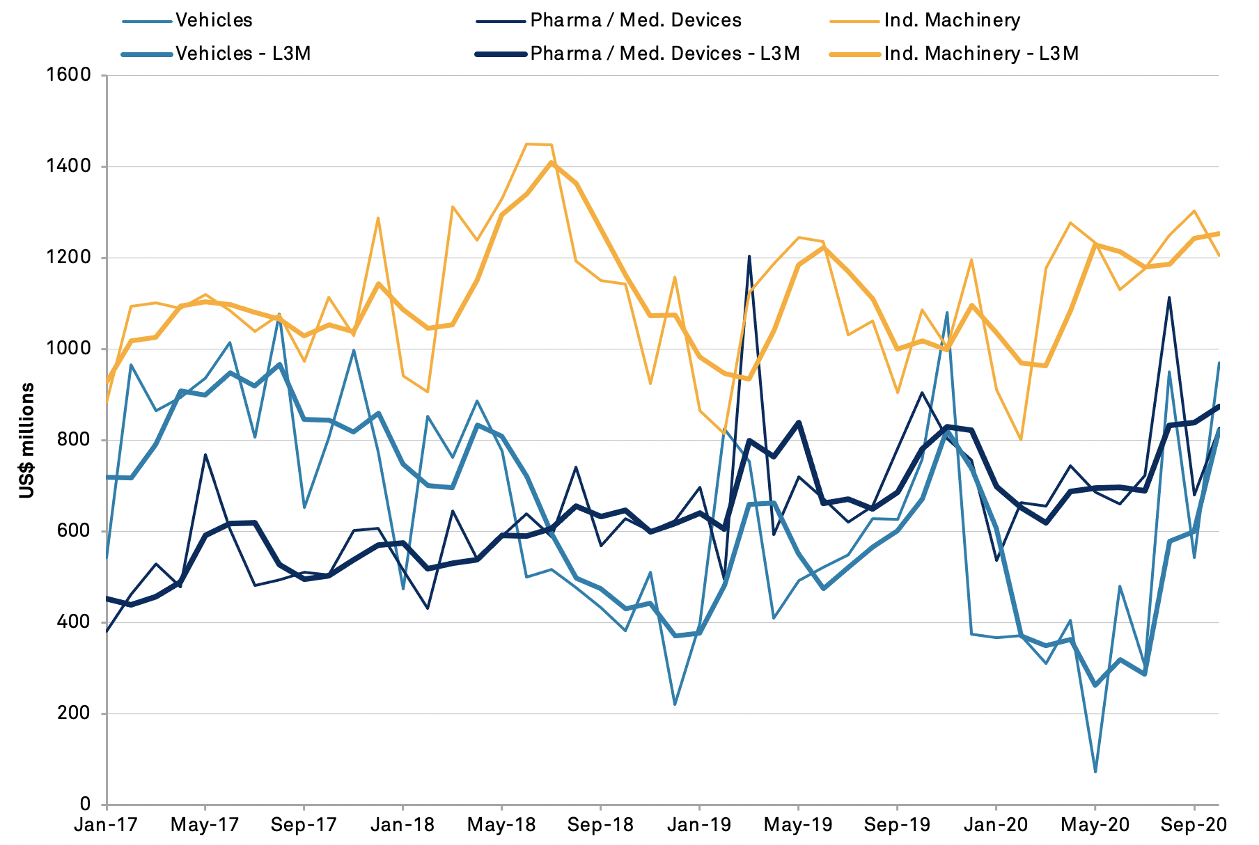 That confirms the President-elect’s previously stated tough-on-China stance stated ahead of the elections, as discussed in Panjiva’s research of Nov. 2. There is still a risk that the outgoing Trump administration may seek to force a more hawkish stance on the Biden administration by withdrawing from the phase 1 trade deal and pushing tariffs upward. That appears to be a low probability risk at the moment with the administration instead focused on incremental measures such as a potential ban on Chinese firms listing on U.S. stock exchanges reported by Reuters.