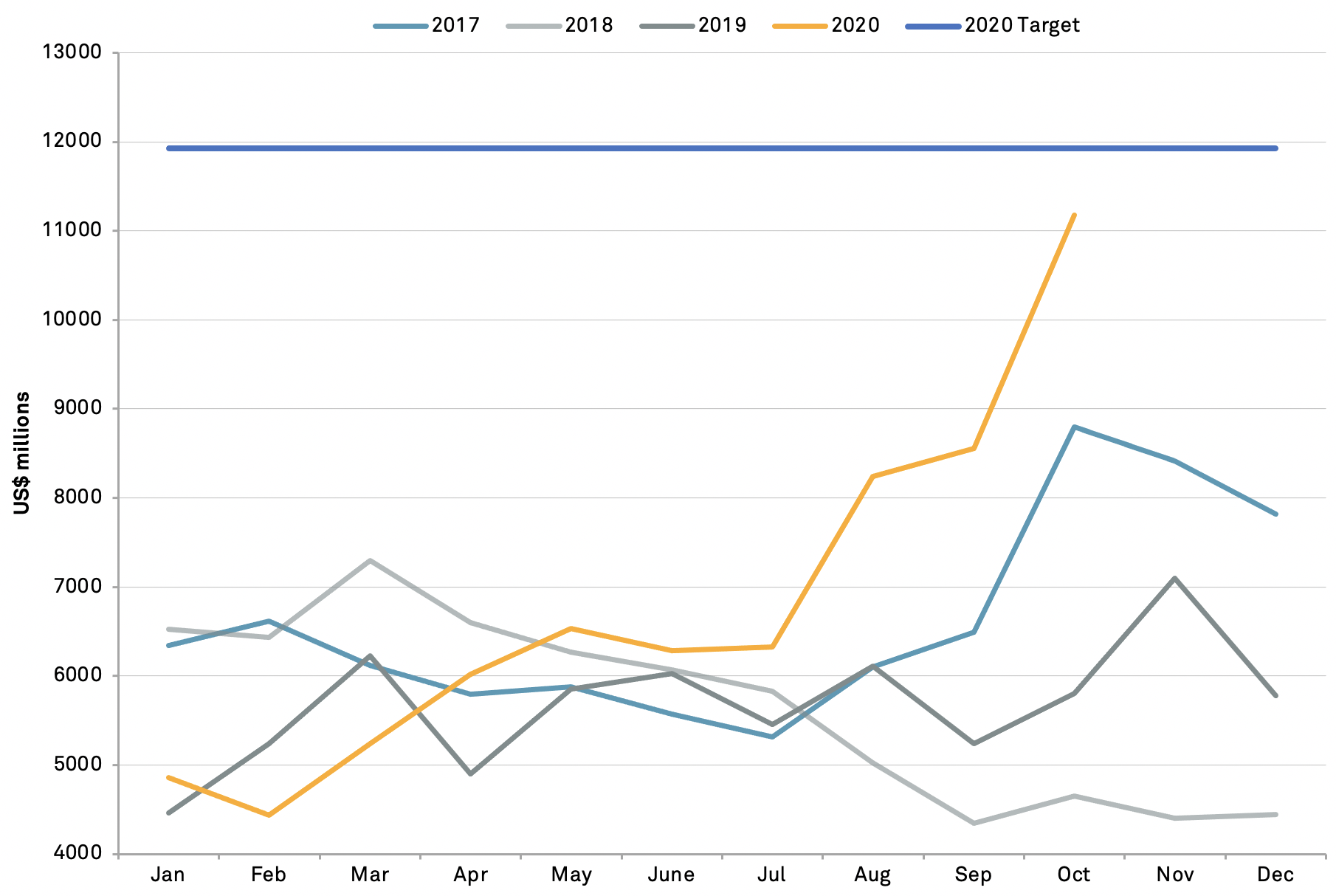 Exports of agricultural products have led the way, reaching $4.84 billion, up by 308% compared to 2017 and led by the delivery of soybeans worth $3.50 billion. It should be noted though that weekly deliveries in November may have slowed, raising the risk that momentum may be lost.