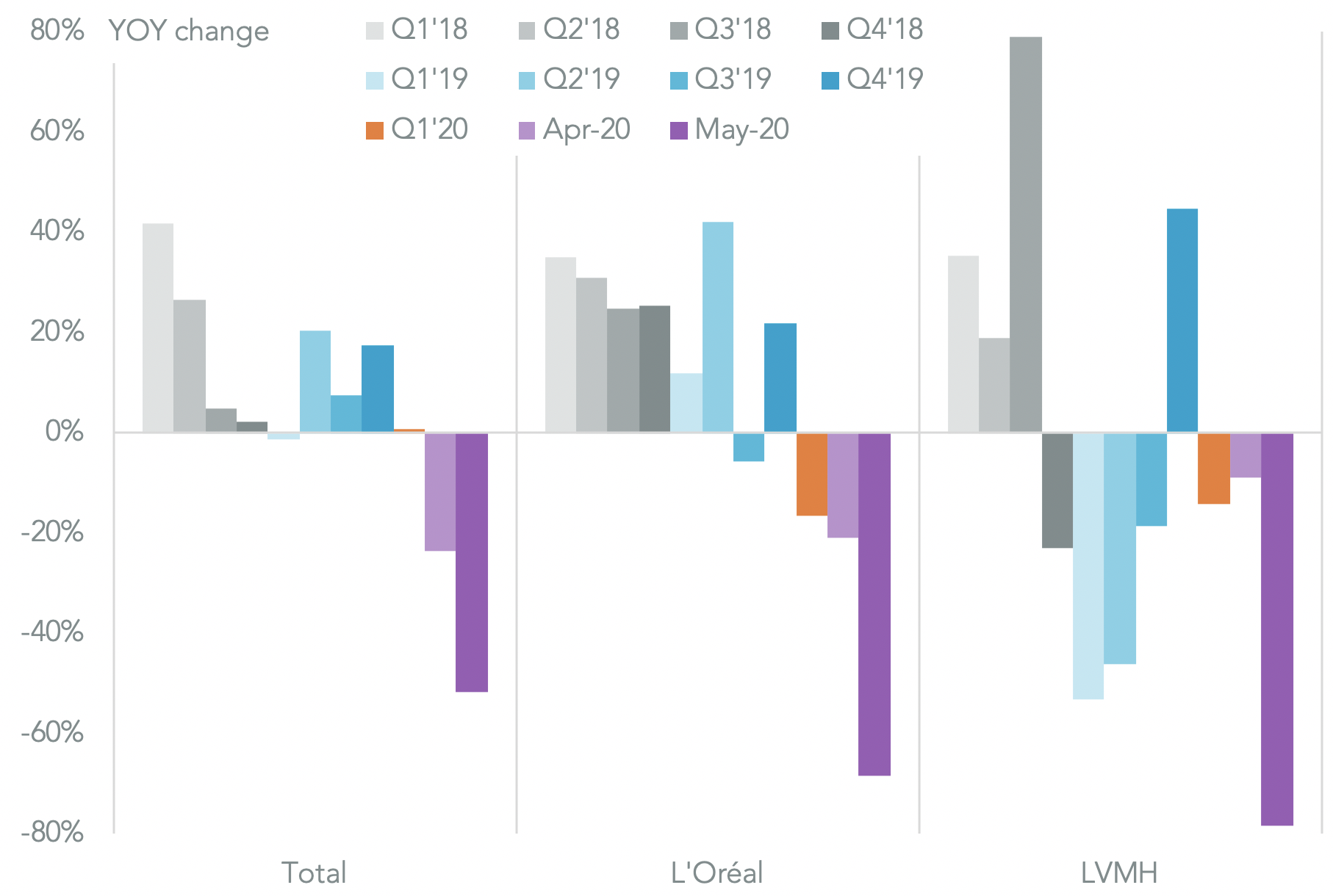 Panjiva’s U.S. seaborne import data shows that the primary targets for tariffs on beauty products would be L’Oreal and LVMH. Both have already seen a slump in their shipments of luxury goods as a result of COVID-19 and a weakening U.S. economy.