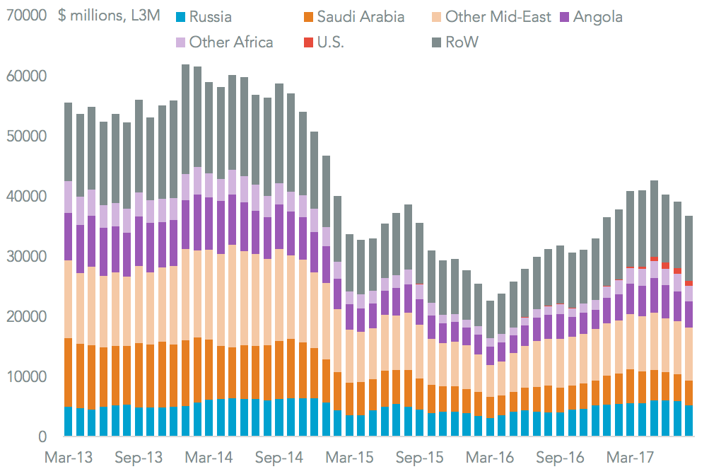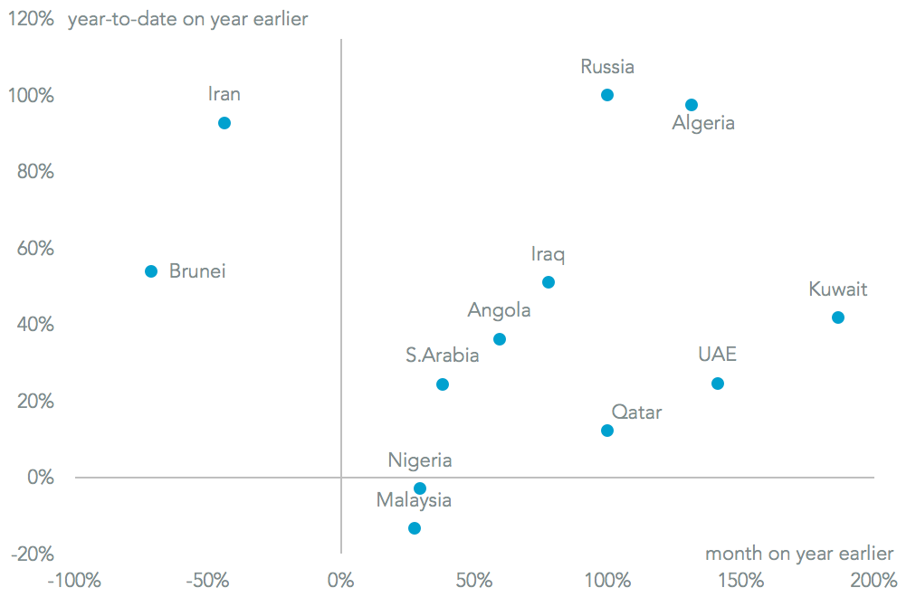 The tanker operators may have fared better elsewhere in the world. India’s imports of crude oil grew by 52.7% on a year earlier in August in dollar terms. Increased shipments from Iraq (77.7% higher) and the UAE (141.2% above the prior year) were the main drivers though imports from Kuwait grew the quickest. Only a handful of shipments has so far arrived in India from the U.S. The growth in imports is supporting a rapid growth in refined oil products, which grew 41% in September, as outlined in Panjiva research of October 16.