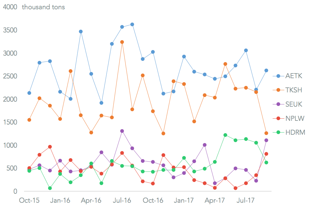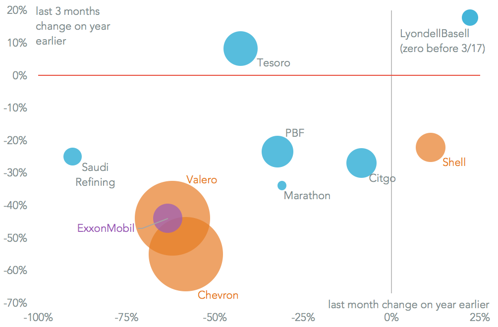 As can be expected from the prevalence of refineries on the gulf of Mexico, the Hurricane interruptions greatly cut refiners’ need for imports. Among the majors both Chevron and Valero saw marked declines, with Chevron’s imports falling 58.3% on a year earlier in September, Panjiva data shows, and Valero’s by 62.1%. Shell meanwhile saw an 11.0% expansion – it has a broad distribution of assets around the country.
