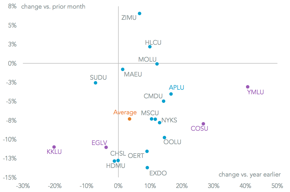 It therefore wasn’t a surprise to see the best performing shippers being Yang Ming (40.7% higher), COSCO Shipping (26.8% better) and CMA-CGM’s Neptune Orient (16.6%). There was still nonetheless clear competition for volumes, as well as restructuring with alliances as Evergreen experienced a 3.8% decline and K-Line a 20.2% slump.