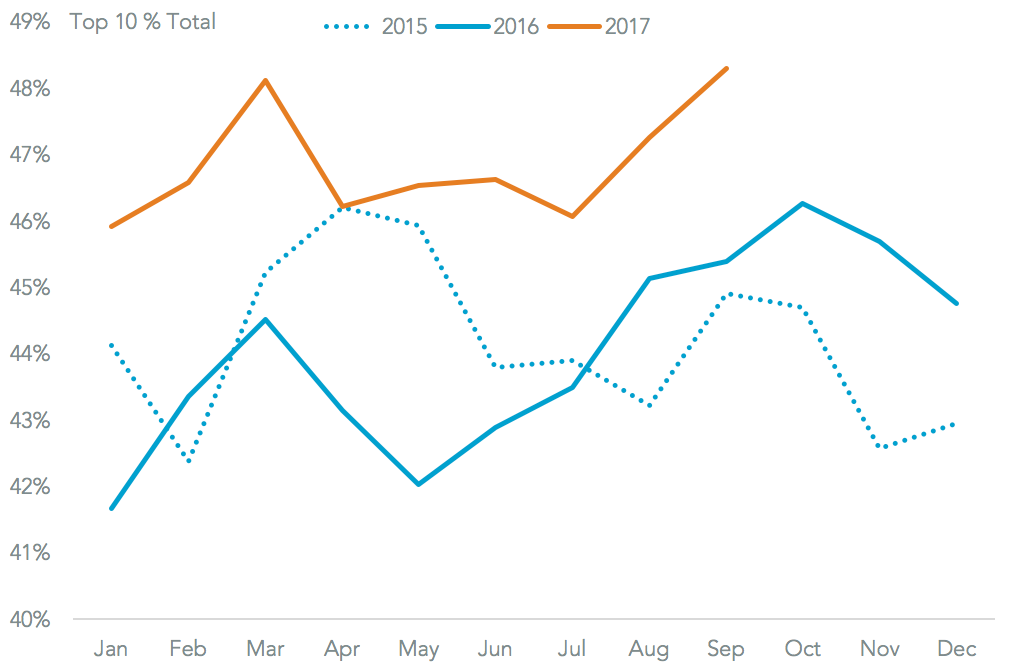 The process of organic consolidation continues too, with the larger operators winning market share from smaller operators. The failure of Hanjin Shipping in August 31 2016 appears to have started a “flight to scale” that’s resulted in the top 10 carriers holding a 48.3% share of shipments in September. That compares to 43.1% for the first quarter of 2016, and was the highest for a single month since at least the start of January 2015.