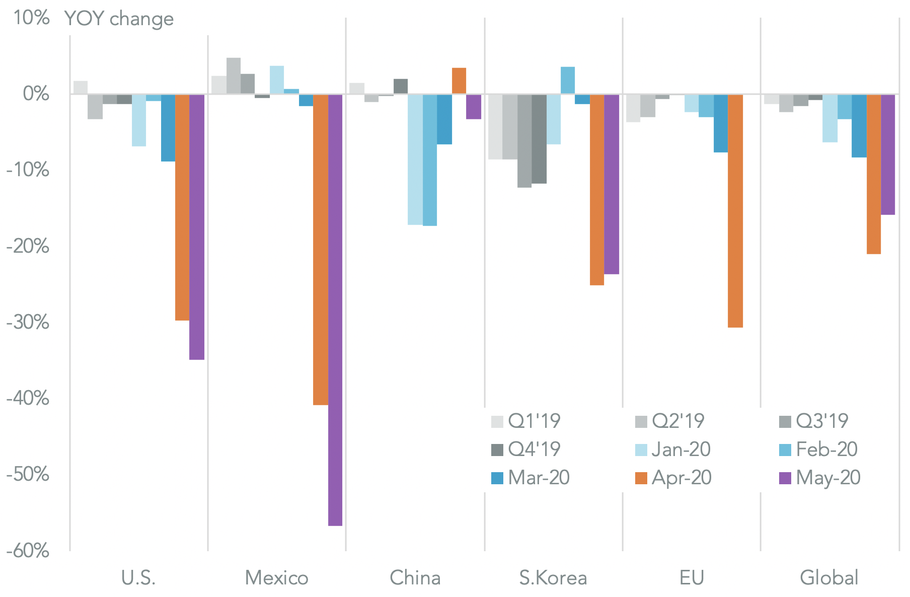 The first two stages of COVID-19’s impact can be clearly seen in global export data. Panjiva’s analysis shows global exports across 37 countries plus the EU dropped by 8.4% in March before slumping 21.0% lower in April. In May there’s a small improvement as some Asian markets reopen to a 15.8% decline. Some caution is needed though as May is skewed upwards by China’s export decline being just 3.3% as earlier orders were finally completed and delivered while data for the EU is not available until mid-July.