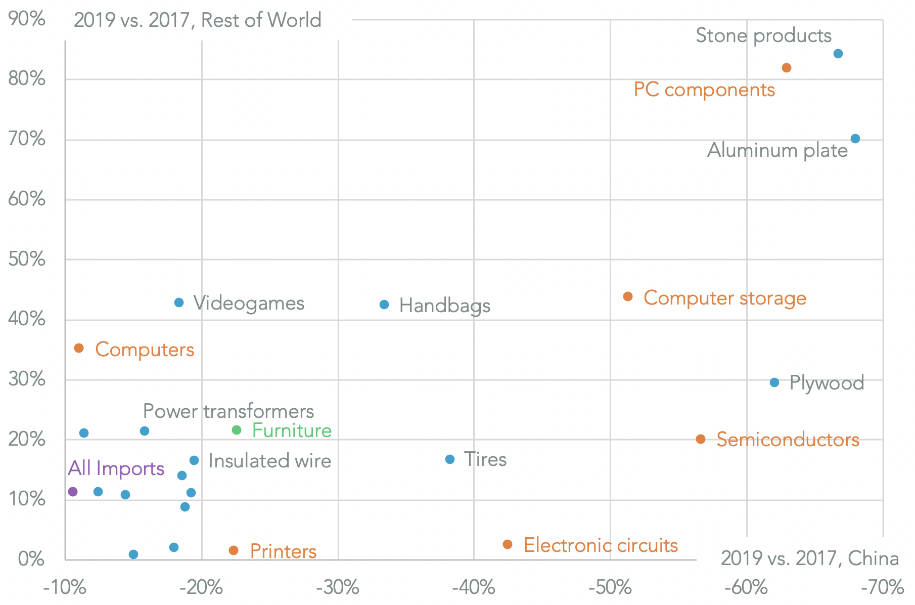 – Diversified overseas sourcing, also known as “China+n”, strategies. This has been the primary reaction to tariffs on U.S. imports from China. Panjiva’s analysis shows this approach has been used in PC components and furniture in response to tariffs. U.S. imports of PC parts from China fell by 62.9% year over year in 2019 compared to 2017 while those from the rest of the world surged 81.8% higher. In the case of furniture a 22.6% slide in imports from China was offset by a 21.7% increase in imports from elsewhere.