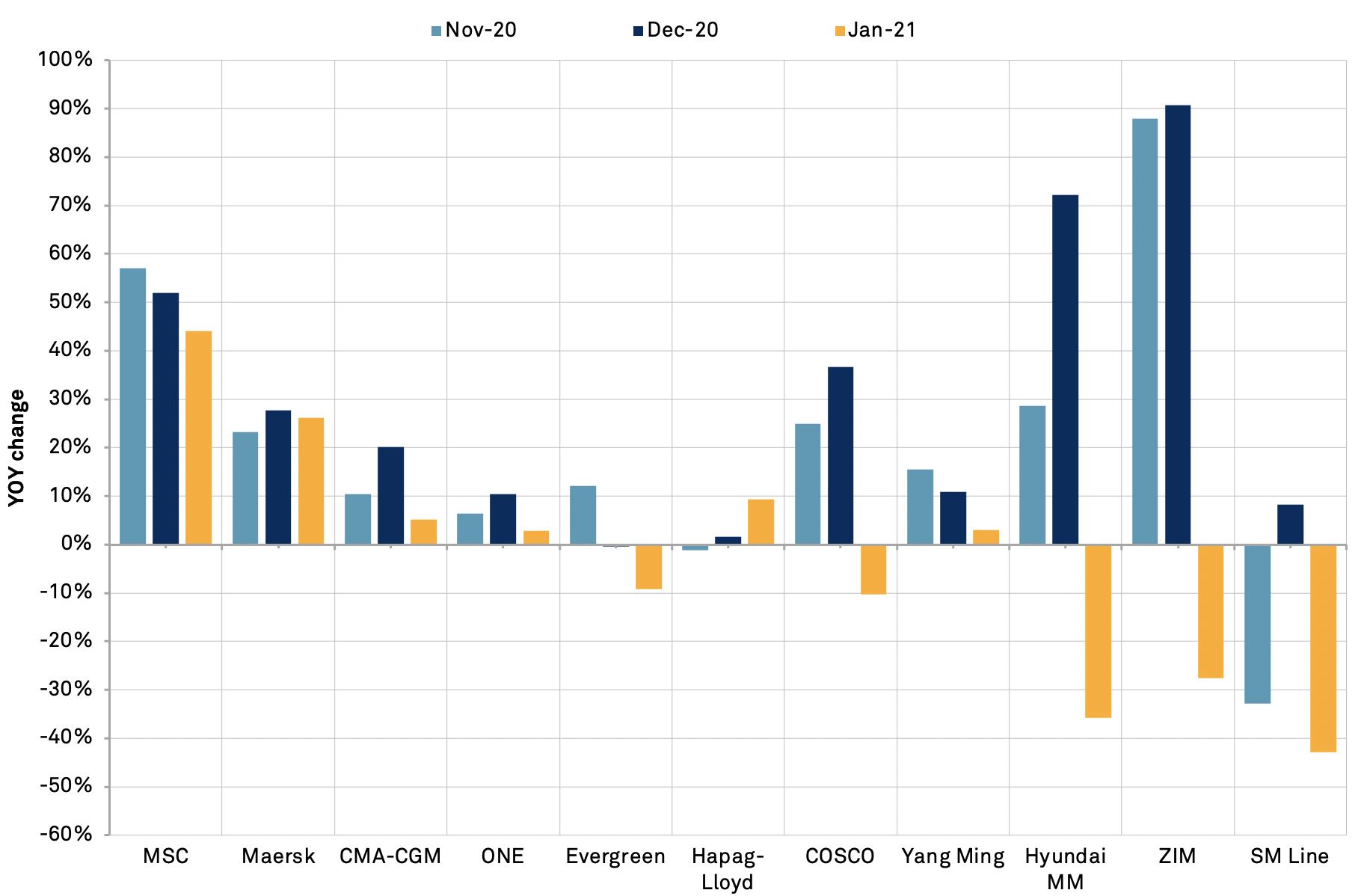 While allowing for a clearance of port congestion and equipment imbalances – which should lead to improved reliability – the blanks won’t address increased demand nor will they potentially allow the normal seasonal decrease in shipping rates that follows the lunar new year holiday, discussed in Panjiva’s 2021 Outlook.