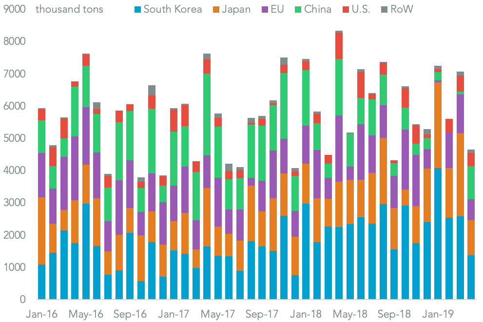 Shipments to all major customer regions declined, though buyers in the EU and China have faced falling exports for most of 2019 so far.