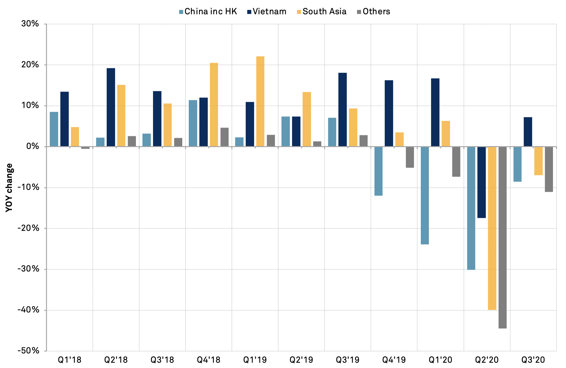 There are signs that supply chains may be retooling towards a focus on textiles for home use rather than those for clothing. That can be seen in a 20.7% surge in imports of home textiles in Q3 including a 361% surge in shipments linked to Welspun. Meanwhile imports of winter clothes, which typically peak in Q3, fell by 21.1% compared to a year earlier including a 24.7% drop in shipments linked to Sumec Corp.