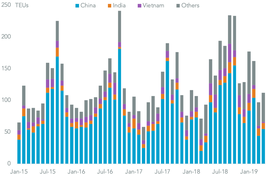 Yet, there is little sign of it pulling out of China, which accounted for 59.9% of its imports in the past 12 months. Shipments have climbed 29.9% year over year in the 12 months to Apr. 30, while the growth rate has accelerated to 59.8% in the past three months.