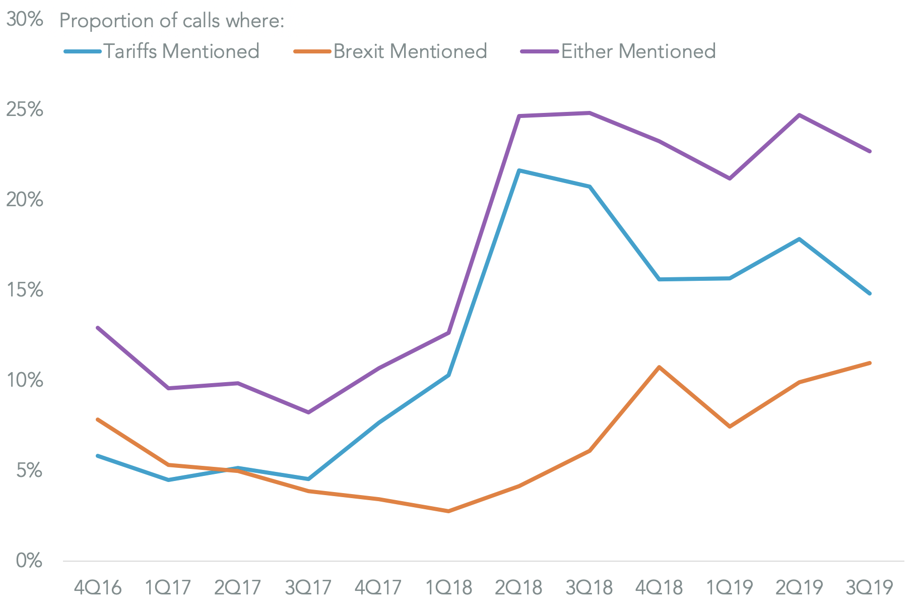 Panjiva’s analysis of 1,142 calls transcribed by S&P Global Market Intelligence since Oct. 1, 2019 shows 22.7% mention either tariffs or Brexit, down from 24.7% in 2Q calls. While that would suggest a reduced interest in trade policy, it’s worth noting that the same group only represents around 1/7th of calls that will likely occur, and is biased towards the financials and non-hardware technology sectors which have had little to say historically anyway.