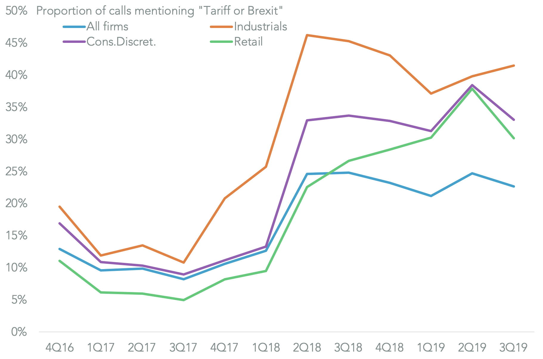 Among the major sectors, the Industrial remain most preoccupied with trade policy, with 41.5% of calls so far this quarter mentioning either tariffs or Brexit. That was followed by consumer discretionary with 33.1% with retail (both discretionary and staples) at 30.2%.